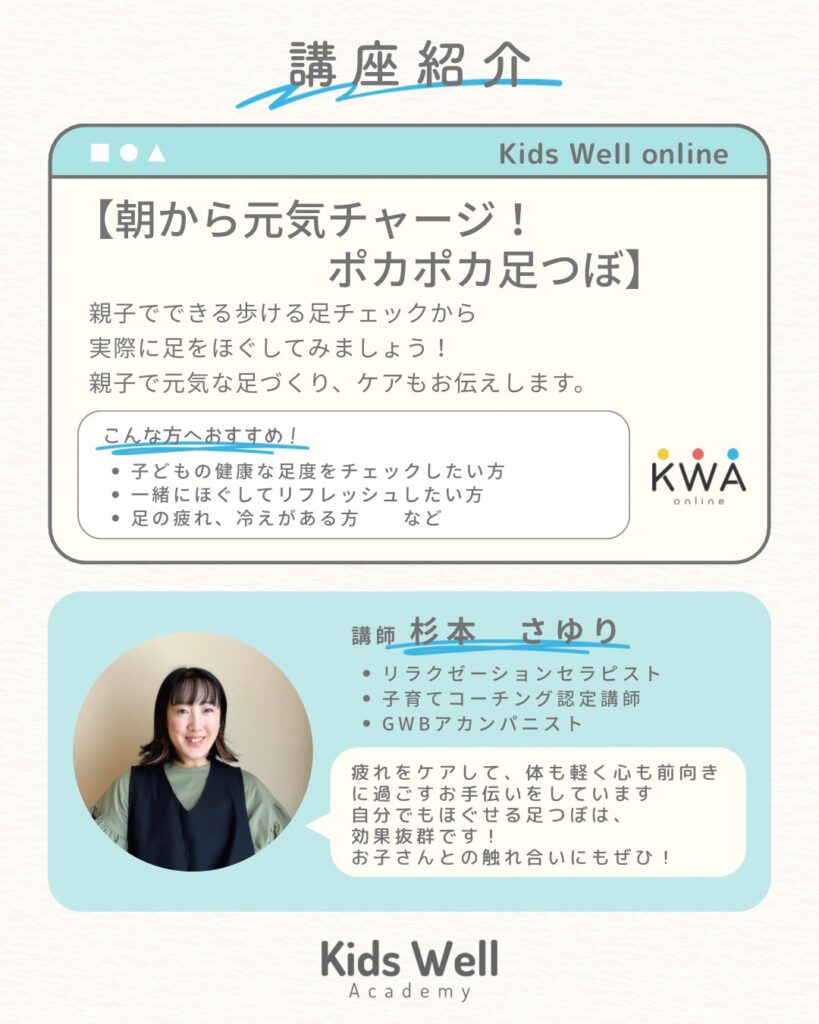 親子でできる歩ける足チェックから、実際に足をほぐしてみよう!親子で元気な足づくり、ケアもお伝えします!
